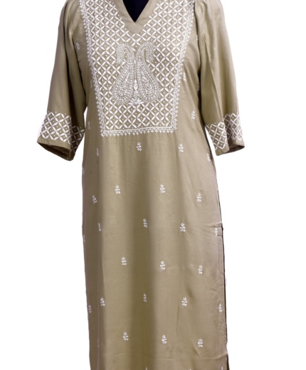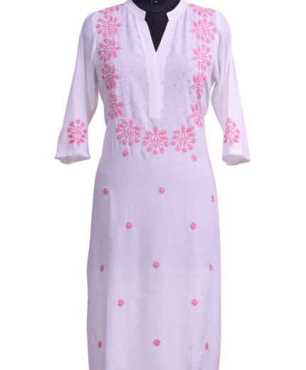 Rayon Kurti – White – Pattern Floral – Embroidery Thread – Peach