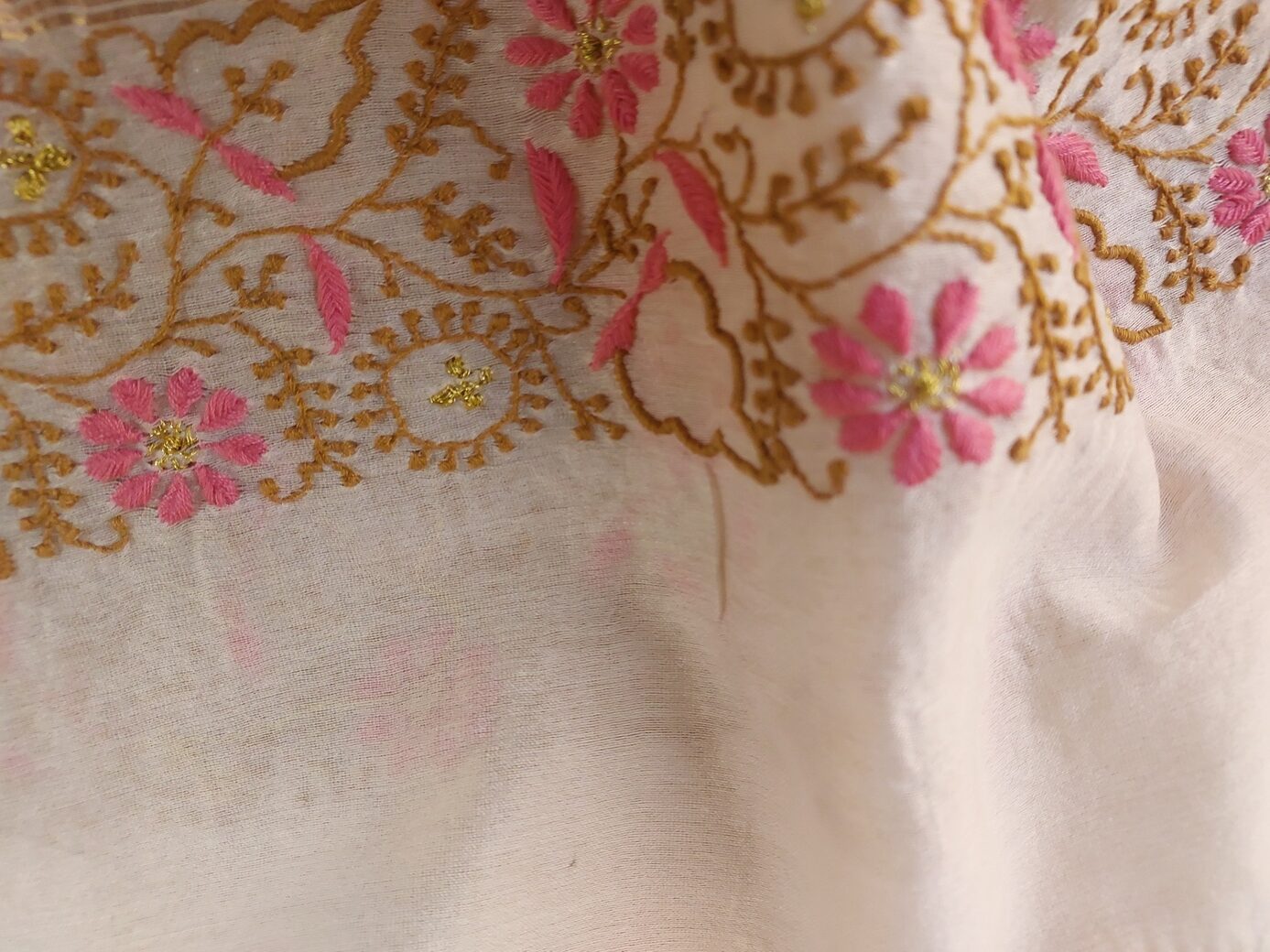 Home / Women / Chanderi Chikankari Hand Embroidered Dupatta Chanderi Chikankari Hand Embroidered Dupatta₹2,400.00 1 in stock Chanderi Chikankari Hand Embroidered Dupatta quantity Add to cart Add to Wishlist Compare Categories: Chanderi, Dupatta, Women Product ID: 7597 Description Description Dupatta – Pure Chikankari Hand Embroidered Fabric –Chanderi Color –Natural Embroidery Thread Color –Pink and Fawn Pattern – Border, and Butty length – 2.5 m Dyeable Fabric. Hand wash/gentle Machine wash in cold water Related products Georgette Kurta and Dupatta Set – White ₹5,000.00 Add to cart Cotton Suit – Pink ₹4,450.00 Add to cart Cotton Suit – Sky blue ₹4,500.00 Add to cart Cotton Suit – Lemon Yellow ₹4,450.00 Add to cart
