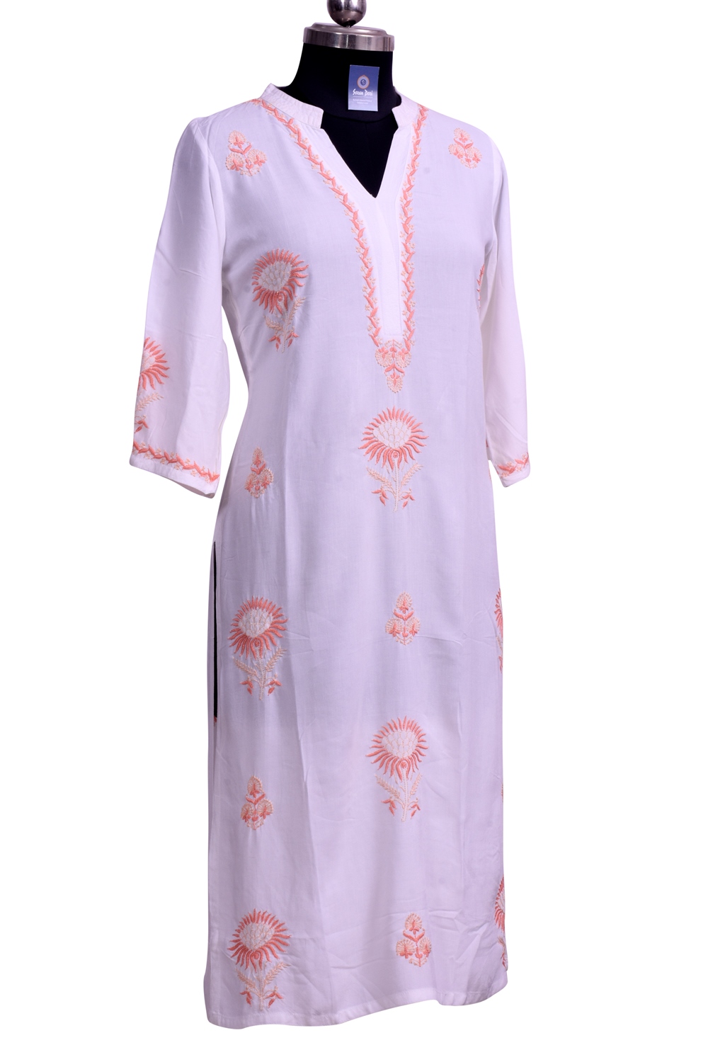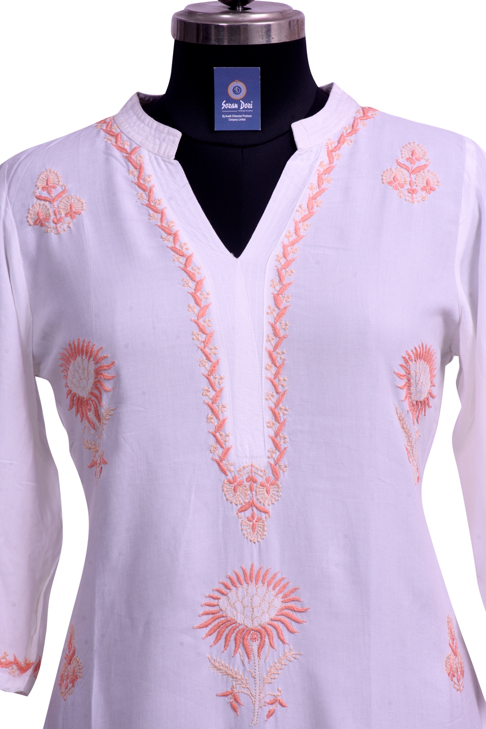 Rayon Kurti – White – Pattern Floral – Embroidery Thread – Peach